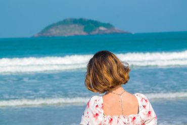 As cores vibrantes evocam a beleza natural da região, com o azul do mar e o verde da natureza, enquanto o sol radiante simboliza a energia e a alegria de viver em um lugar paradisíaco.